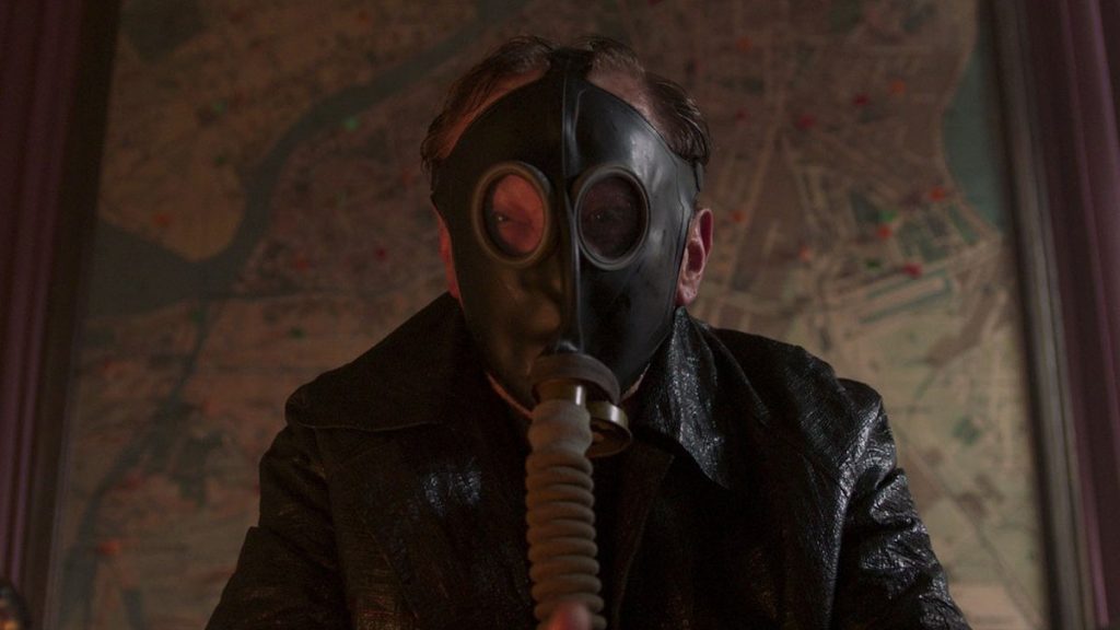 Lovers of post-Soviet Russian cinema will feel echoes from past masters of absurdist Stalinist nightmares, such as Aleksei German, in particular his Khrustalyov, My Car! (1998)—the bald male head, authoritative bodies toned through gymnastics, the grotesque comedy of the purges—and Aleksandr Rogozhkin’s Chekist (1992)—with its artfully arranged, Boschian piles of corpses. Lovers of the run-down, surreal Soviet aesthetic will bask in the world of Captain Volkonogov Escaped: a louring zeppelin, creaky trams, gas masks, pipes clinging like tentacles to crumbling buildings, and heaps upon heaps of dilapidated grandeur (even if it doesn’t reach the depths of murkiness and grime plumbed in celluloid by Chekist).