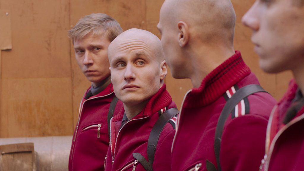 Leningrad, 1938. The Stalinist purges are in full swing, and the secret police have set up shop in an appropriated Tsarist-era palace, all gold leaf and chandeliers, its parquet floors spread thick with hay to soak up the blood from tortured confessions. Young Captain Volkonogov (Yura Borisov of Anora fame) is tight with his mates in the death squad: when not working over enemies of the Revolution, they dance, sing, trade slaps, and bump skulls like boarding-school bros—in matching blood-red tracksuits, heads shaven to a gloss. (The polished male cranium holds a particular appeal for wife-and-husband director/writers Natasha Merkulova and Aleksey Chupov.) But these bad boys’ smooth, glowing heads will soon contort into agonized webs of veins when the bullets start flying the other way, for top management has ordered a purge of the purgers (corresponding historically to the moment Stalin decided his paramilitary had gotten out of control). When Volkonogov sees his old boss leap to his death from a window and his fellow enforcers serially disappear, he rightly reckons he’s next and slips out past the guards just as his name is called.