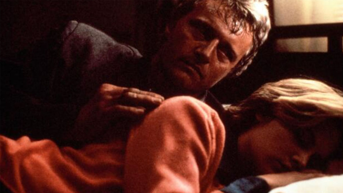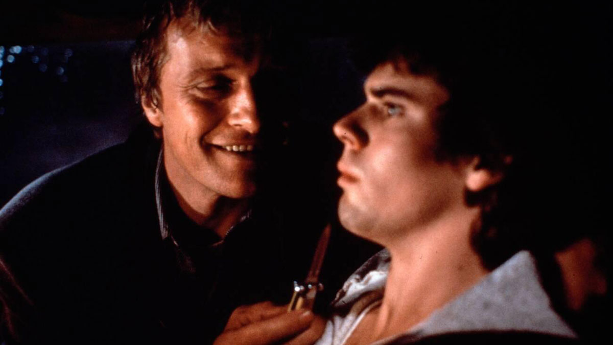 Four years after playing a killer desperate to dodge extinction—Roy Batty in Blade Runner—Rutger Hauer played John Ryder in The Hitcher (1986), a killer courting oblivion. A Dutch actor with near-flawless English, Hauer nevertheless brought an unnerving, alien quality to his roles. He is especially effective here in Robert Harmon’s film, which begins like a conventional ’80s slasher whose title fairly shouts its narrative contours. Five minutes into his ride with Jim Halsey (C. Thomas Howell), Ryder tells the boy he’s going to cut him into pieces, and we buckle up for the body count. But Hauer’s detailed performance transforms the film into something powerful and strangely meditative, providing a counterpoint to screenwriter Eric Red’s tight, relentless pacing. While this quintessential American road movie screams by like a truck rushing to deliver nothing to nowhere, Hauer fills its dusty metal carapace with a soft body, rendering a sensitive portrayal that combines camaraderie, sadism, and bone-deep exhaustion. He plays the reaping highwayman less as a villain and more as a cursed wandering soul—call him the Driving Dutchman—charged with enforcing life’s cruel moral physics.