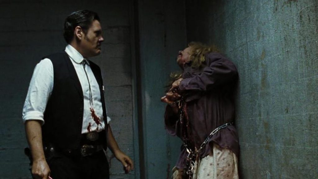 The Devil’s Rejects picks up almost immediately after House of 1000 Corpses’ end, as a rash of good-old-boysy lawmen descend on Firefly Ranch, the site of the first film’s looney-tune torture time. Led by Sheriff Wydell (William Forsythe), who fancies himself an avenging angel and can’t wait to replace his badge with his self-proclaimed “devil slayer” vigilante heritage. The law in The Devil’s Rejects is as itching to violate bodies as the anarchic Firefly family, and while Baby (Sheri Moon Zombie, always shot like the love of Zombie’s life; always the light limning these films’ grungy corpuses), her adoptive brother Otis (Bill Moseley), and father Captain Spaulding (Sid Haig) inflict plenty of grisly acts on their trail, leading from that opening shoot-out through the film’s oily, on-the-run structure, the scenes maybe most likely to make the spectator hide behind fingers come courtesy of Wydell. He turns a cattle prod on human flesh, sticks knives in rib cages then twists them, and nails palms into rotting wood. On a recent rewatch, I thought about 3 from Hell (2019), Zombie’s later, near-elegiac close to the Firefly trilogy. It’s a less fun but no less essential statement on American violence, existing as it does closer to the historical crash of whatever the counterculture could have meant to a country founded on and policed by violent urges. In that film, locked up and denied parole, the now fully unhinged Baby taunts a correction officer with lurid come-ons. “I live inside your head, I live inside your head,” she coos, before a breakout sees her don—what else?—a police uniform.