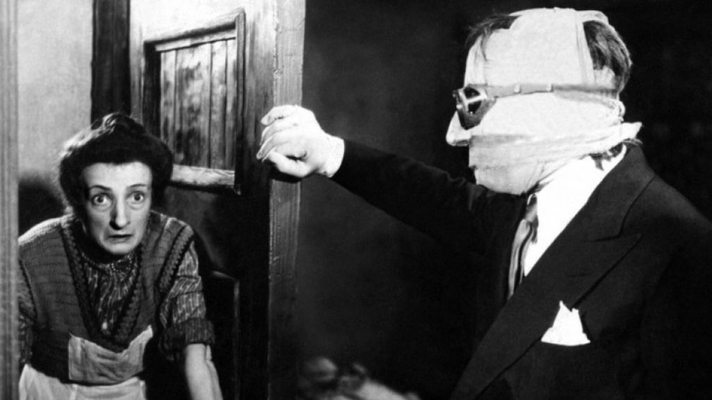 Right behind these monsters—in terms of cinematic potency, if not widespread influence—is the Invisible Man, played—mostly unseen—by Claude Rains in the film of the same name directed by James Whale in 1933. One suspects that those who know the movie love it dearly, while others, having read a summarizing line or two, are apt to give it a pass on the basis that this monster is heard rather than seen—at least directly. We’re often left with an indirect visual of him as he leaves footprints in the newly fallen snow, knocks over a stroller with a chubby-cheeked innocent inside, or swats the hat off a copper’s head.
